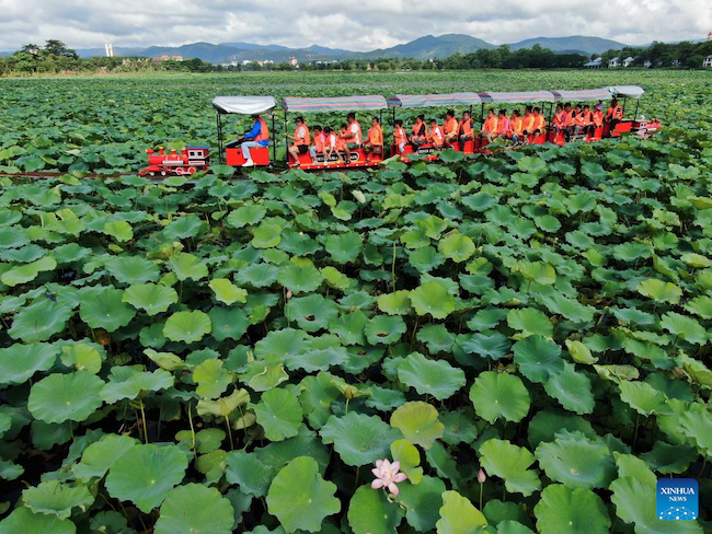 Στι? παρακ?τω αεροφωτογραφ?ε? που τραβ?χτηκαν στι? 2 Ιουλ?ου 2022 μπορο?με να δο?με επισκ?πτε? να πα?ρνουν ?να τρεν?κι για περι?γηση στα αξιοθ?ατα για να απολα?σουν τα νο?φαρα τη? λ?μνη? Λονγκντ? στην π?λη Τζινχ?νγκ τη? αυτ?νομη? περιοχ?? Σισουανμπαν? Ντ?ι, στην επαρχ?α Γιουν?ν τη? νοτιοδυτικ?? Κ?να?. (Φωτογραφ?α/Xinhua)