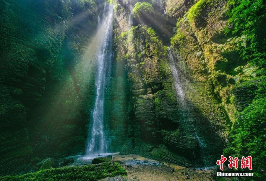 Η φωτογραφ?α δε?χνει ?ναν καταρρ?κτη στο σπ?λαιο Φε?γο? (δηλαδ? τη? ιπτ?μενη? ομ?χλη) σε μια καρστικ? οροσειρ?, στο γραφικ? αξιοθ?ατο του βουνο? Μπογου?νγκ, στην π?λη Γιμπ?ν, τη? επαρχ?α? Σιτσου?ν τη? νοτιοδυτικ?? Κ?να?, στι? 12 Μα?ου 2022. (Η φωτογραφ?α παρ?χεται στην υπηρεσ?α China News Service)