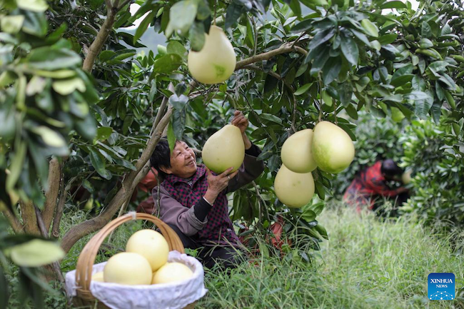 Χωρικο? συγκομ?ζουν γκρ?ιπφρουτ στην κωμ?πολη Φενγκχου? τη? κομητε?α? Σου??γιανγκ, στην π?λη Τζουνγ?, στην επαρχ?α Γκουε?τζ?ου τη? νοτιοδυτικ?? Κ?να?, στι? 10 Οκτωβρ?ου του 2022. (Φωτογραφ?α: Li Yan/Xinhua)