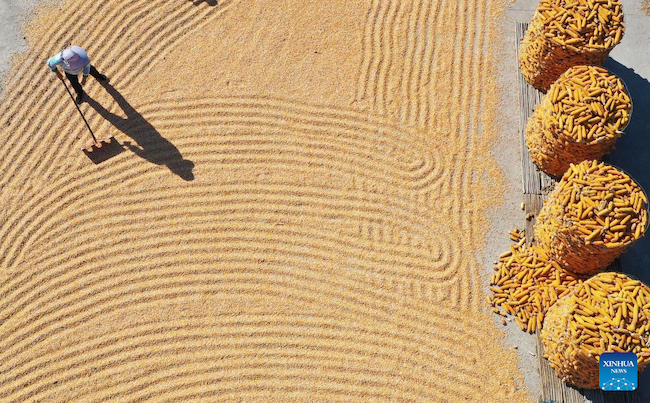Αεροφωτογραφ?α που τραβ?χτηκε στι? 10 Οκτωβρ?ου του 2022 δε?χνει ?ναν χωρικ? να αερ?ζει το καλαμπ?κι που ?χει συγκομιστε? στην κομητε?α Ταντσ?νγκ τη? π?λη? Λινγ?, στην επαρχ?α Σαντ?νγκ τη? ανατολικ?? Κ?να?. (Φωτογραφ?α: Zhang Chunlei/Xinhua)