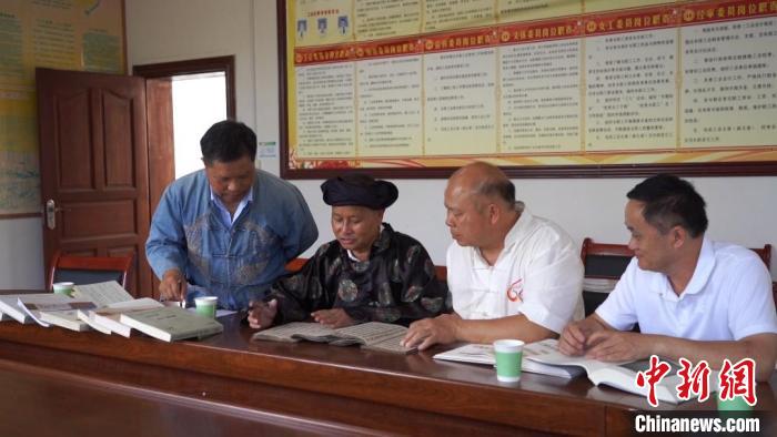 Ο Γιανγκ Σενγκτζ?ο (με μα?ρο κ?λυμμα κεφαλ??) μεταφρ?ζει ?να βιβλ?ο στη γλ?σσα Σο?ι μαζ? με μ?λη του προσωπικο? τη? Ακαδημ?α? Γλωσσικο? Πολιτισμο? Σο?ι στην Αυτ?νομη Κομητε?α Σαντο? Σο?ι στην επαρχ?α Γκουιζ?ου τη? νοτιοδυτικ?? Κ?να?. (Chinanews.com/Pu Wensi)
