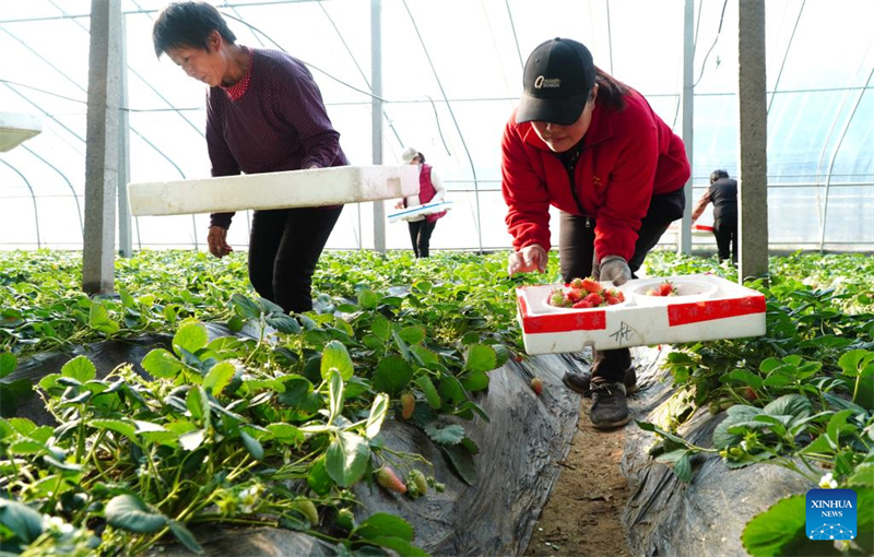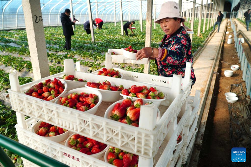 | Οι χωρικο? μαζε?ουν φρ?ουλε? σε ?να θερμοκ?πιο στο χωρι? Γουγι?ν τη? κομητε?α? Ντονγκπ?νγκ, στην επαρχ?α Σανντ?νγκ τη? ανατολικ?? Κ?να?, 16 Φεβρουαρ?ου 2023. |