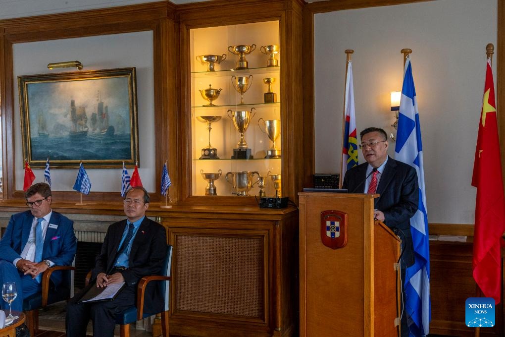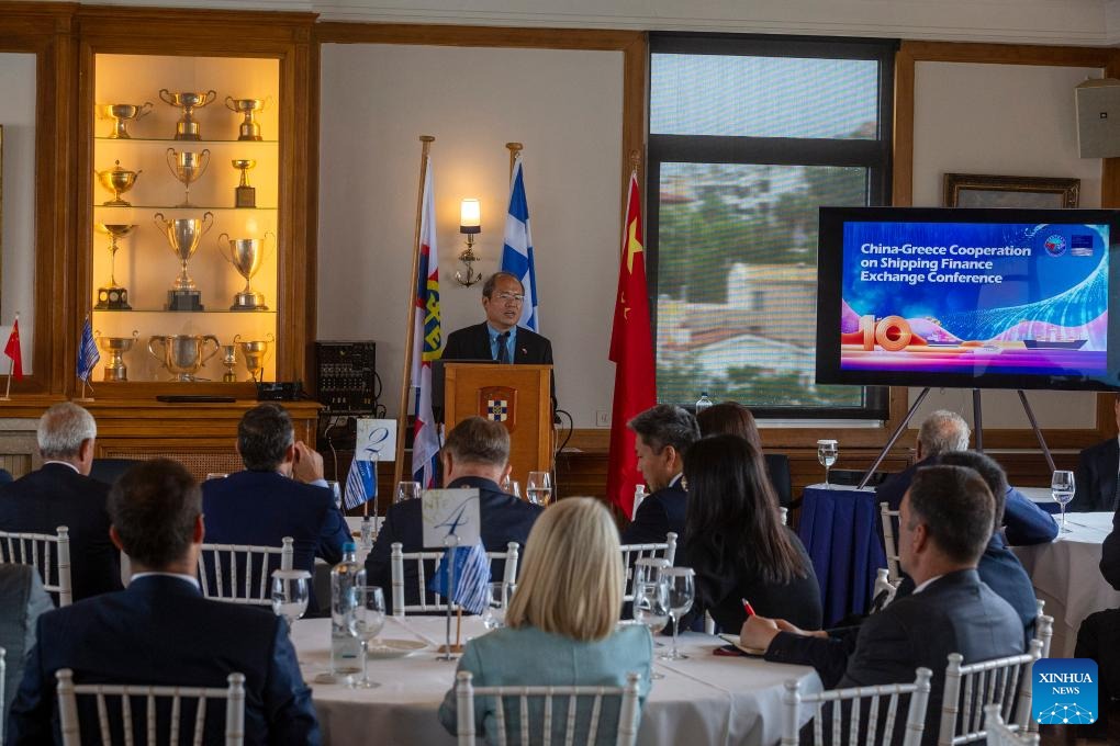 Ο Πρ?σβη? τη? Κ?να? στην Ελλ?δα Σι?ο Τζουντζ?νγκ (Xiao Junzheng) (π?σω) απευθ?νεται στη Δι?σκεψη Συνεργασ?α? Κ?να?-Ελλ?δα? για την ανταλλαγ? χρηματοδ?τηση? τη? ναυτιλ?α? στον Πειραι?, στην Ελλ?δα, στι? 6 Σεπτεμβρ?ου του 2023.