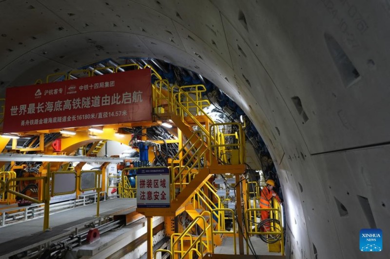 | ?να? εργαζ?μενο? απ? την China Railway 14th Bureau Group Co., Ltd. εργ?ζεται στη μηχαν? δι?νοιξη? σηρ?γγων "Yongzhou" στην υποθαλ?σσια σ?ραγγα Jintang τη? σιδηροδρομικ?? γραμμ?? Ningbo-Zhoushan στην επαρχ?α Zhejiang, ανατολικ? Κ?να, στι? 25 Φεβρουαρ?ου 2025. |