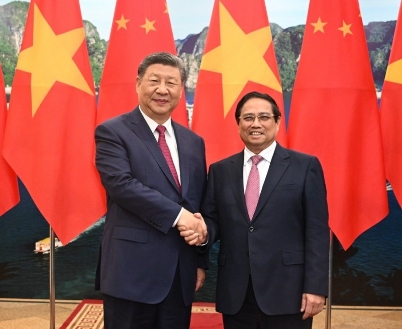 Ο Σι Τζινπ?νγκ, γενικ?? γραμματ?α? τη? Κεντρικ?? Επιτροπ?? του Κομμουνιστικο? Κ?μματο? Κ?να? και Πρ?εδρο? τη? Κ?να?, συναντ? τον πρωθυπουργ? του Βιετν?μ Φαμ Μινχ Τσιν στα κεντρικ? γραφε?α τη? Κεντρικ?? Επιτροπ?? του Κομμουνιστικο? Κ?μματο? του Βιετν?μ στο Αν?ι του Βιετν?μ, 14 Απριλ?ου 2025. (Φωτογραφ?α/Xinhua)
