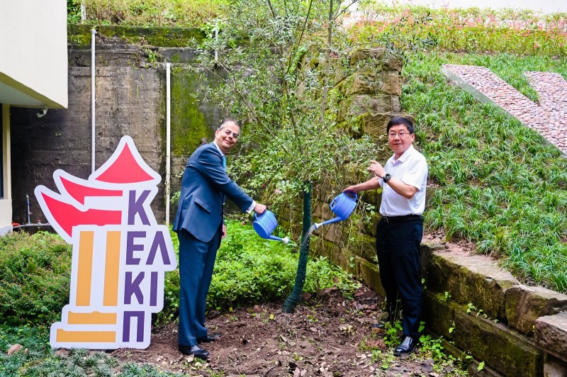 Ο Δρ. Ευγ?νιο? Καλπ?ρη?, Πρ?σβη? τη? Ελλ?δα? στην Κ?να, και ο Ζοο? Φουντο?, Αντιπρ?εδρο? του Πανεπιστημ?ου Νοτιοδυτικ?? Κ?να?, ποτ?ζουν απ? κοινο? μ?α ελι? στον καινο?ργιο "Κ?πο τη? Ελπ?δα?" του ΚΕΛΚΙΠ (Φωτογραφ?α: Κ?ντρο Αρχα?ου Ελληνικο? και Κινεζικο? Πολιτισμο?)